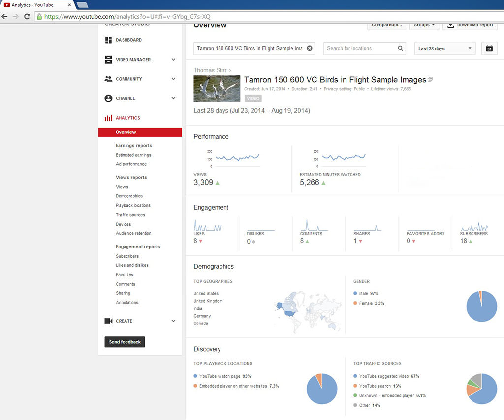 به عنوان مثال، طی چهار هفته گذشته، ویدئوی «پرندگان در حال پرواز» که با لنز Tamron تهیه کردهام، ۶۷ درصد از بازدیدهای خود را از طریق پیشنهادهای یوتیوب دریافت کرده است.