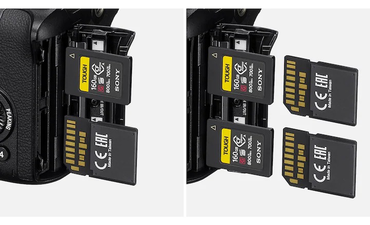 برای نیازهای فیلمبرداری نسل بعد، کارتهای CFexpress Type A از ضبط با بیتریت بالا پشتیبانی میکنند. اسلاتها برای CFexpress Type A و همچنین SDXC UHS-I و UHS-II آماده هستند و دو اسلات مشابه امکان ضبط پشتیبان یا رلهای را فراهم میکند.